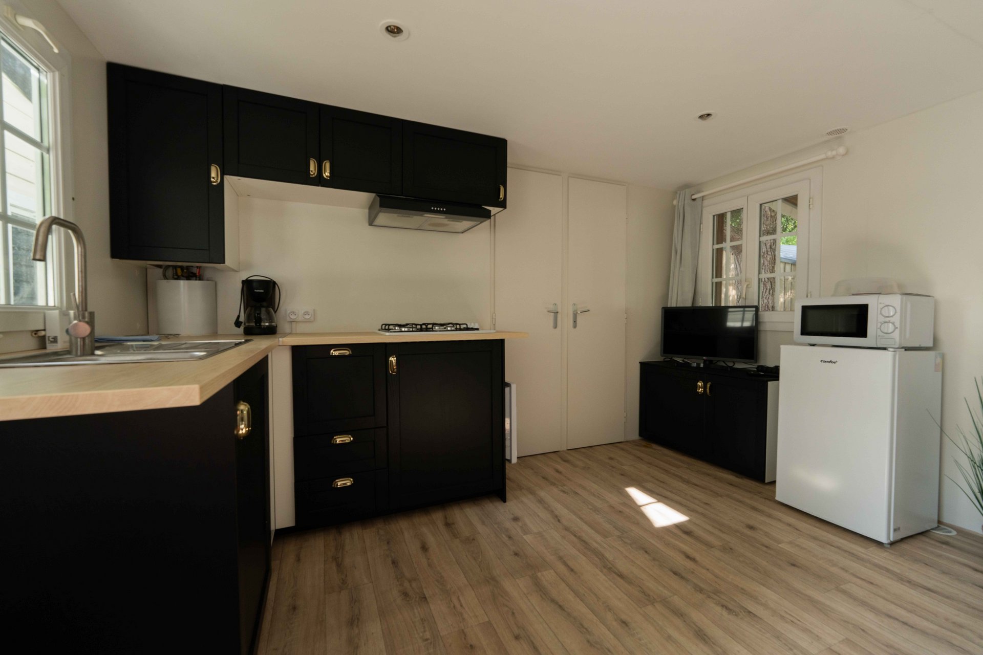 • Coin cuisine équipé (évier, gaz 4 feux, hotte aspirante, four micro-ondes, bouilloire, grille-pain, cafetière, frigo/congélateur).